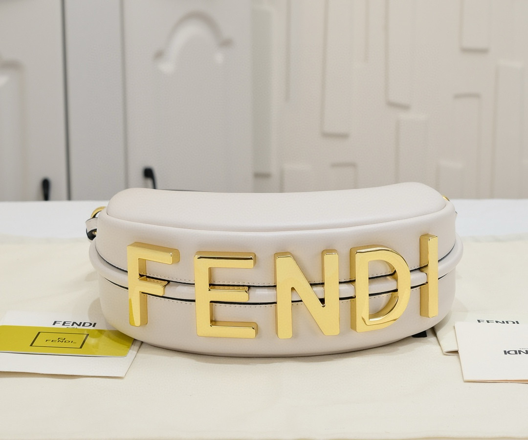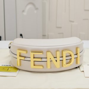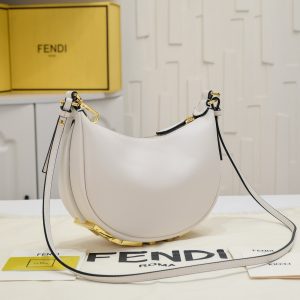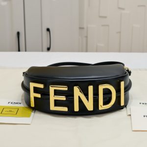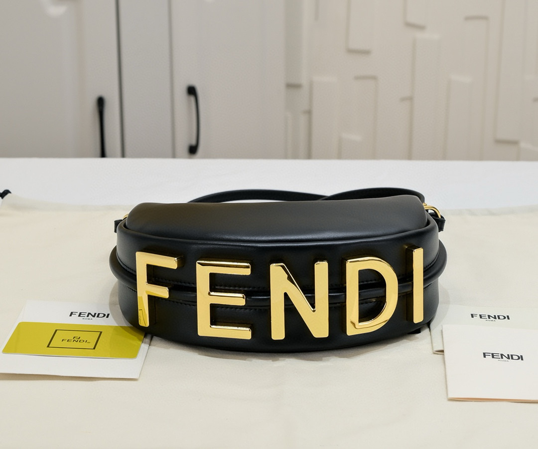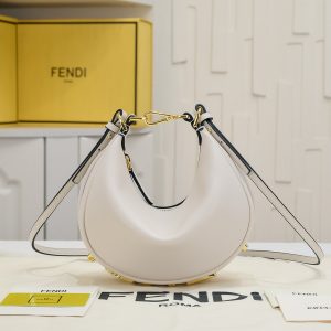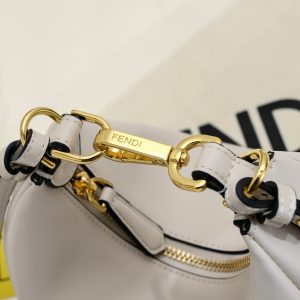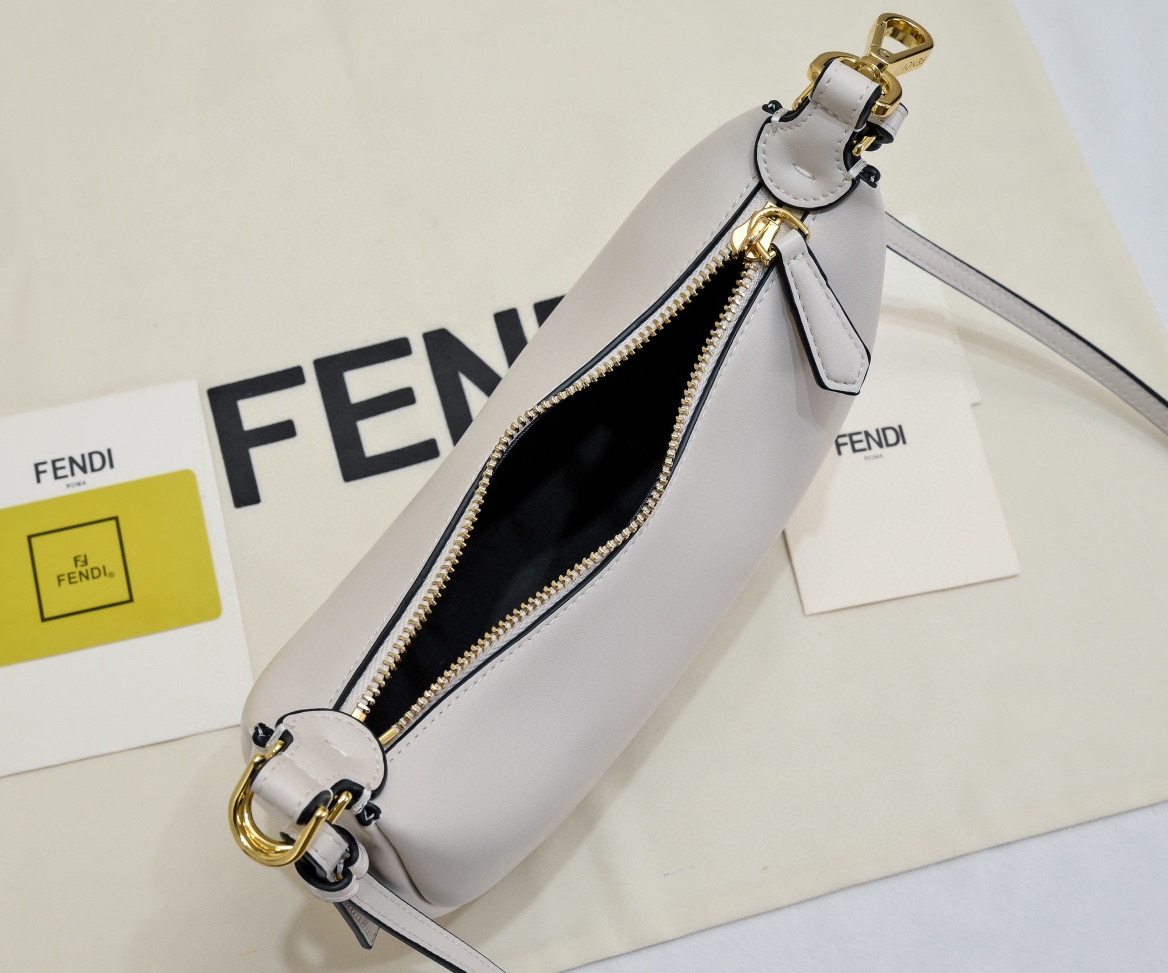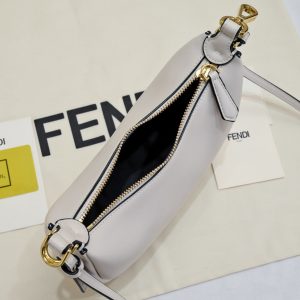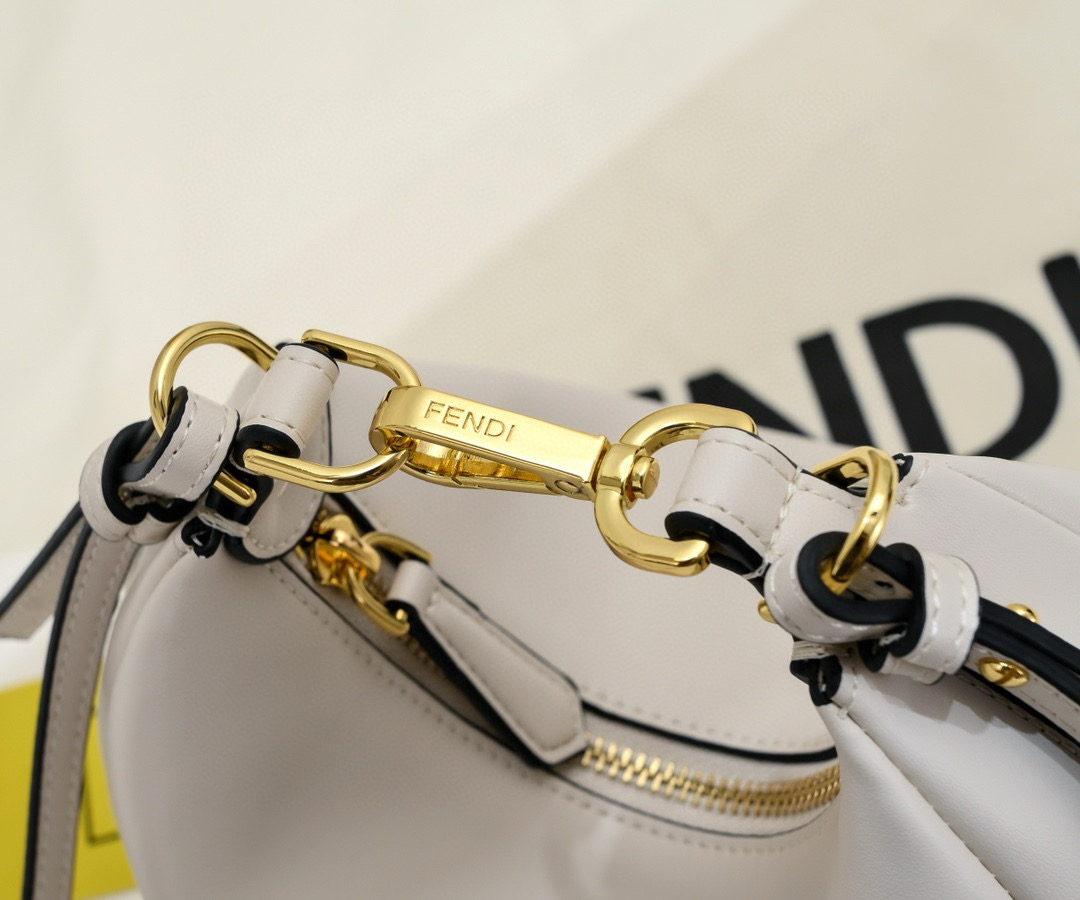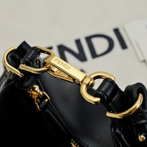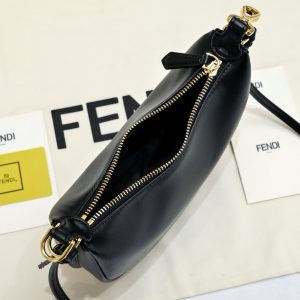 Bolso estilo Hobo confeccionado en piel suave con logo FENDI en dorado visible en la parte posterior. Las asas de piel se pueden ajustar para poder llevar el bolso en la mano o colgado del hombro.