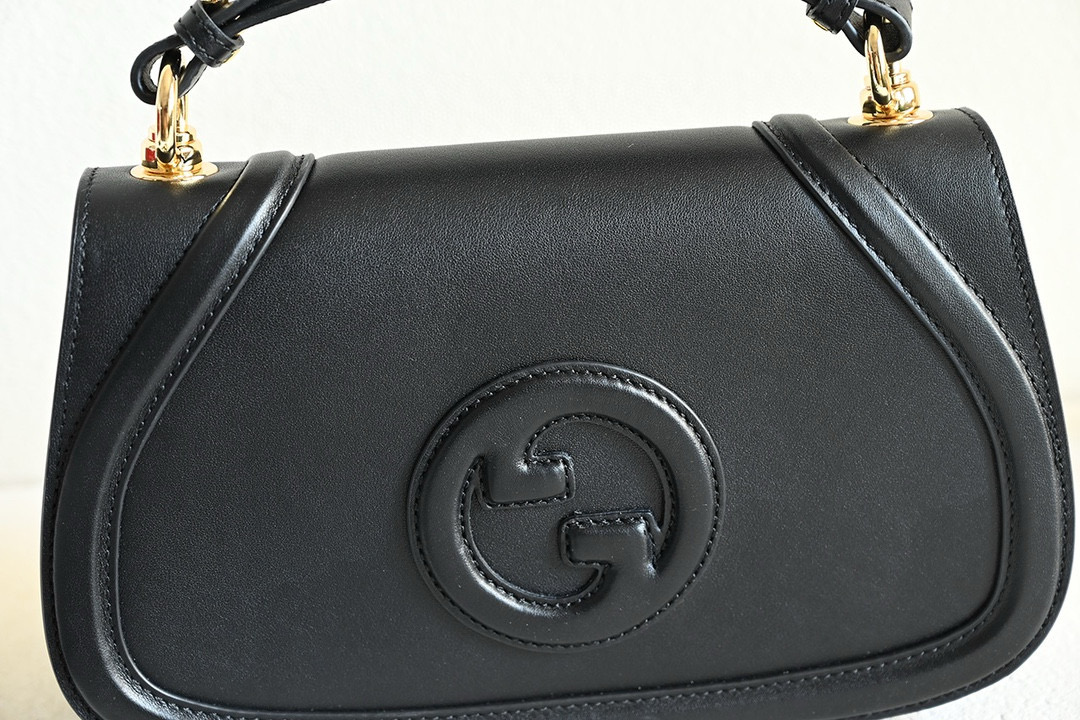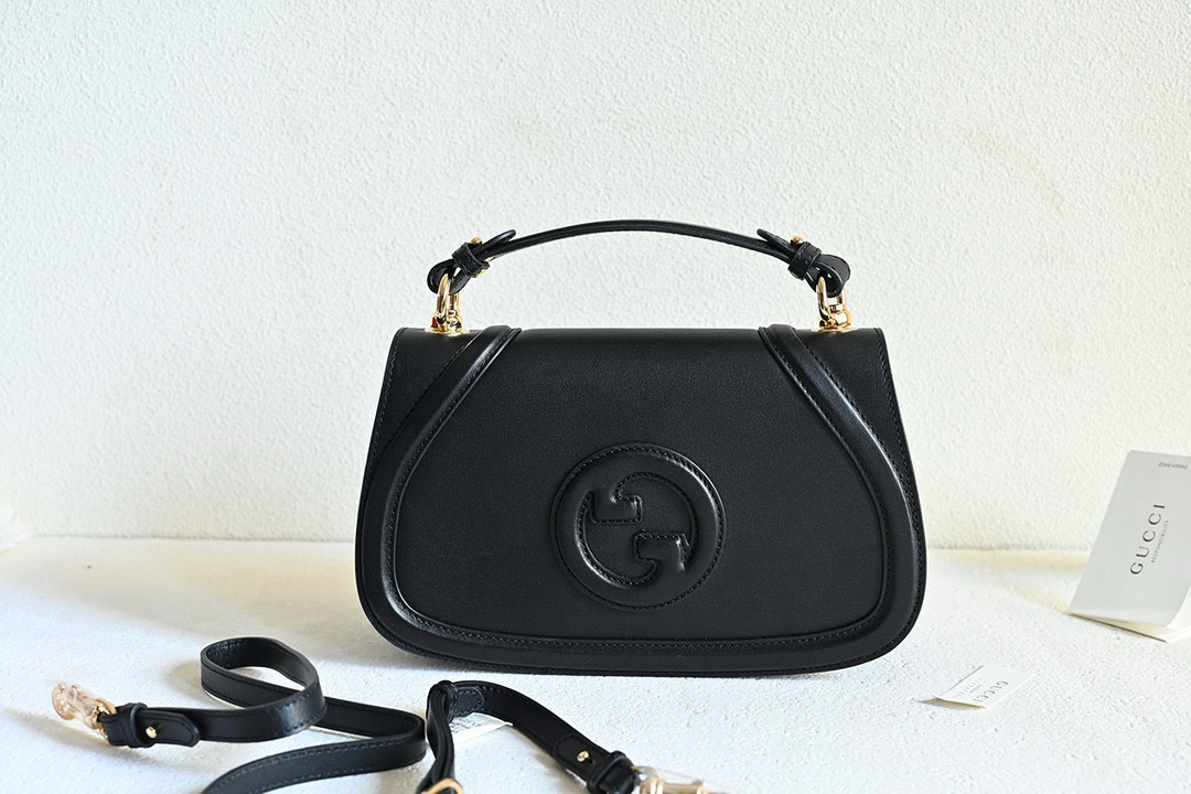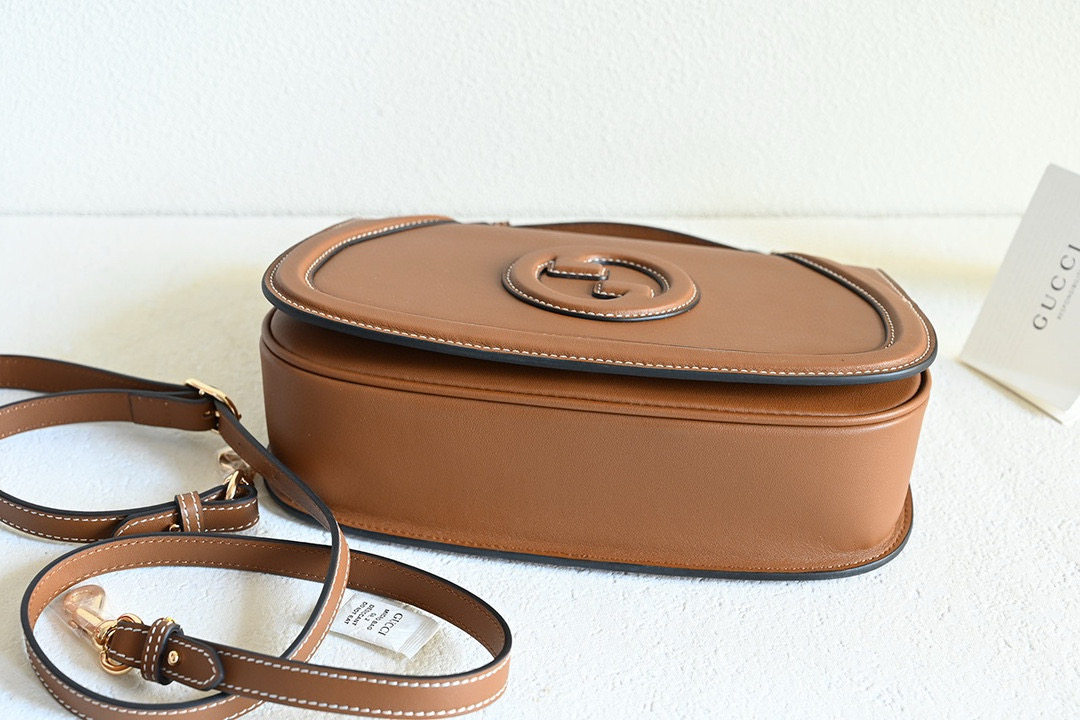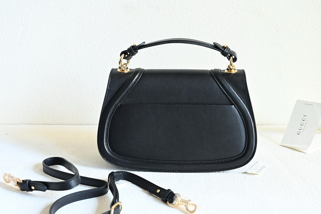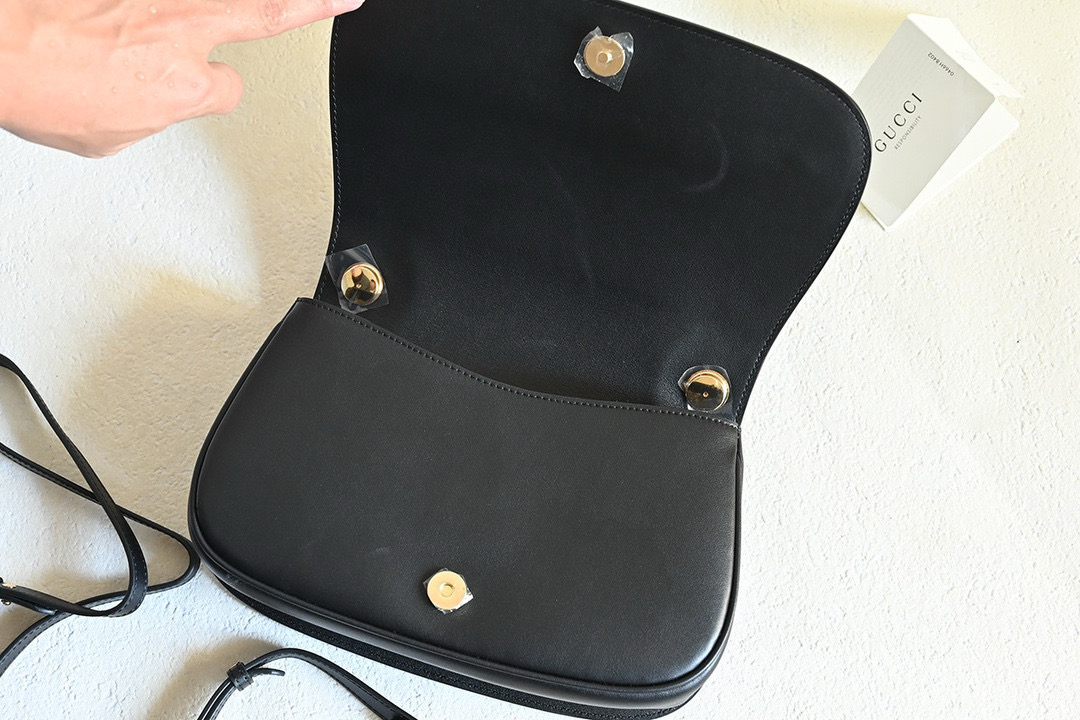Bolso con asa superior y bandolera ajustable de piel suave y forro de lino. Bolsillo interior con zipper y bolsillo exterior abierto en la parte posterior. GG entrelazada redonda y ierre magnético.