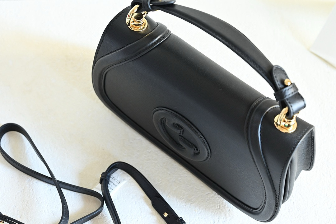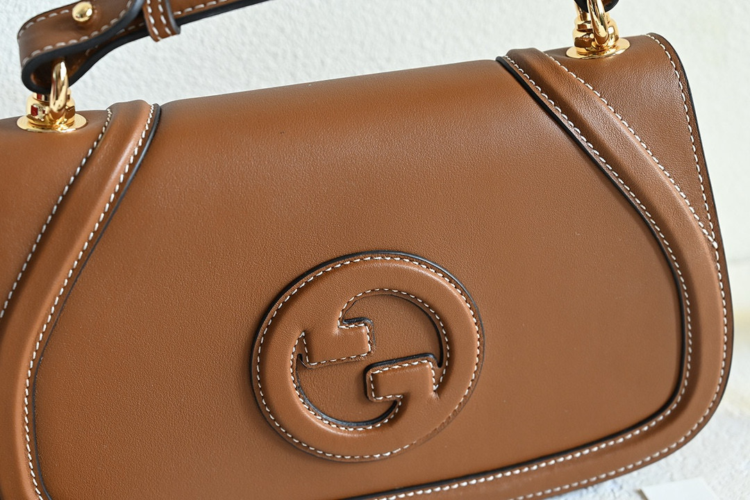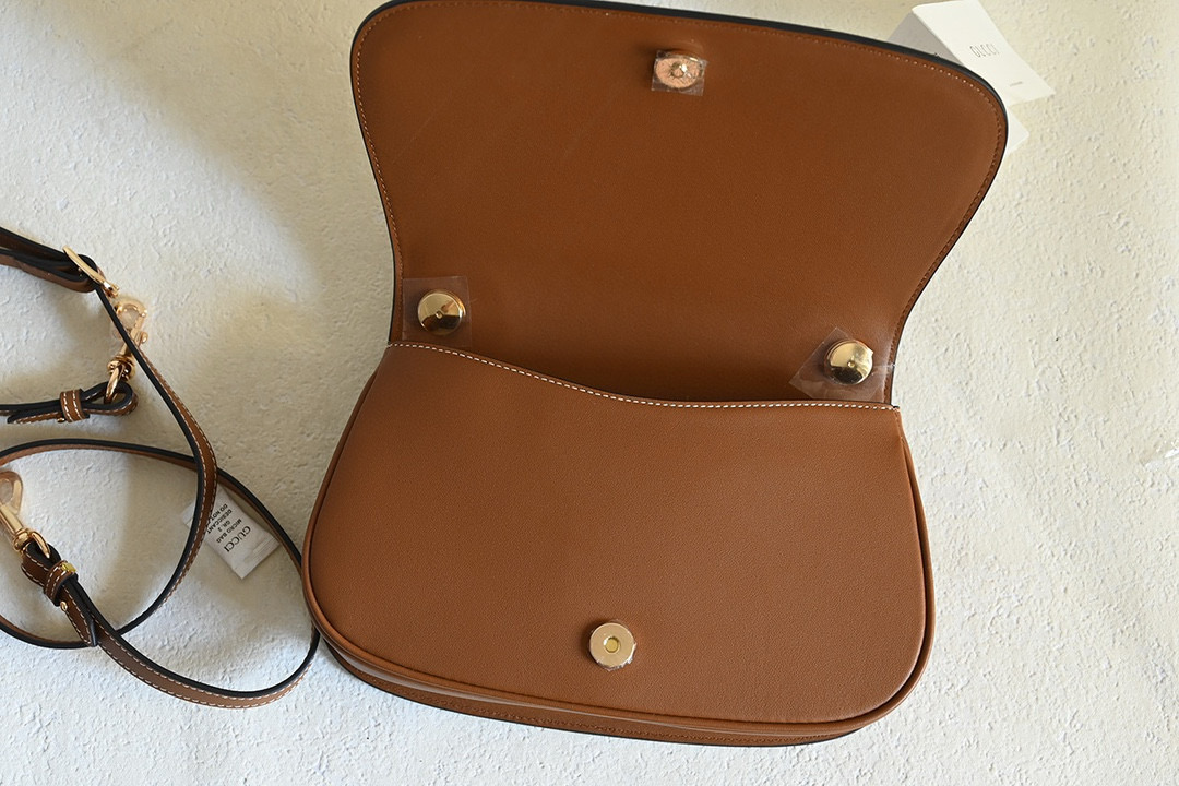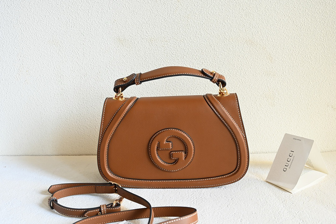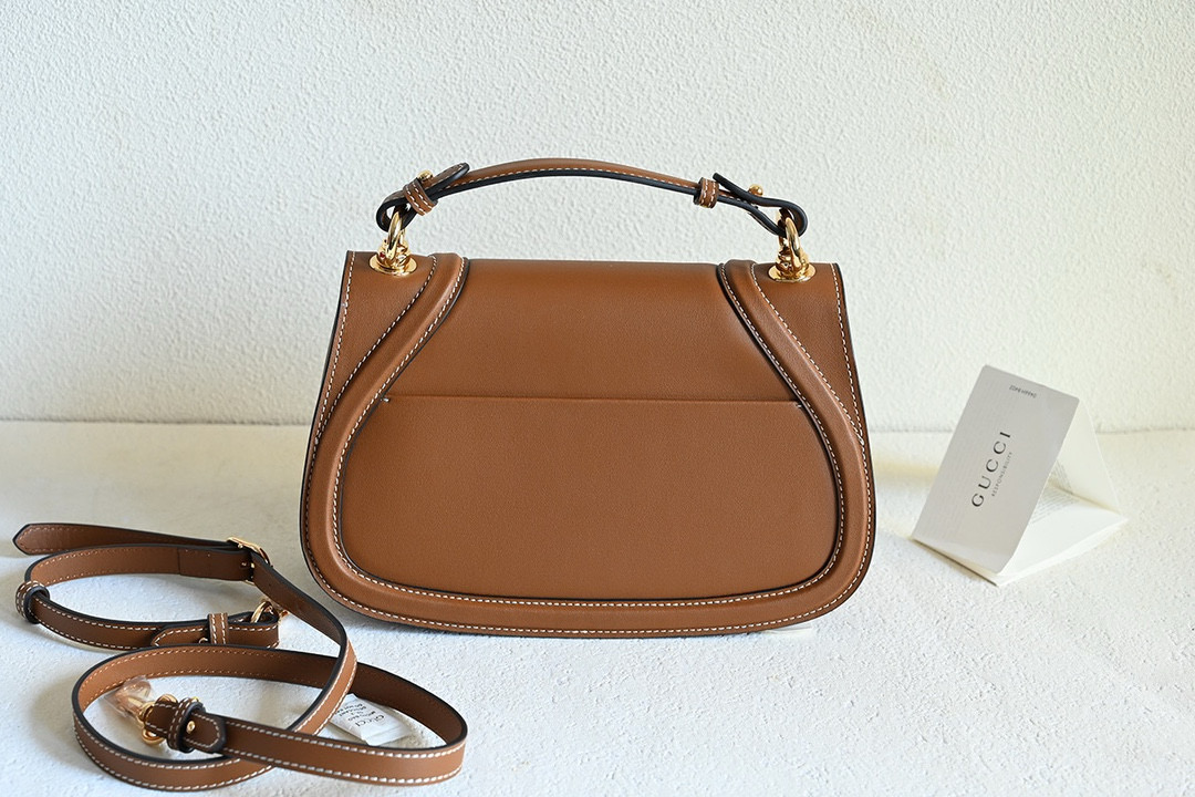 Bolso con asa superior y bandolera ajustable de piel suave y forro de lino. Bolsillo interior con zipper y bolsillo exterior abierto en la parte posterior. GG entrelazada redonda y ierre magnético.