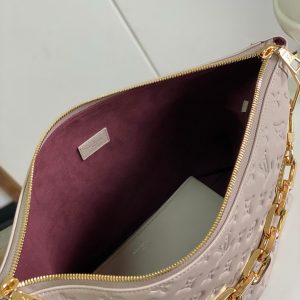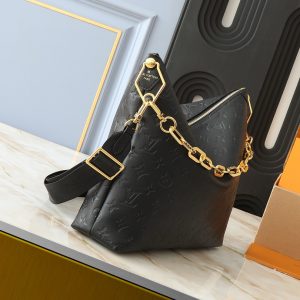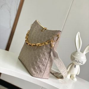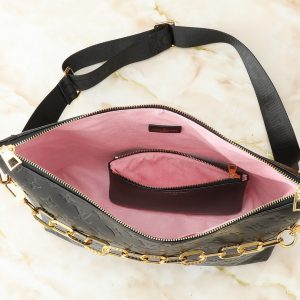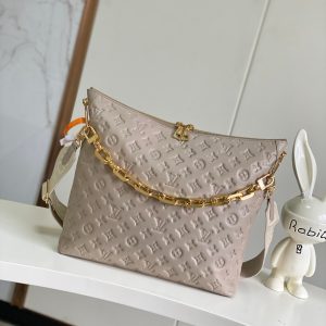 Bolso confeccionado en acolchada piel lisa luce el emblemático Monograma en relieve y una cadena gruesa adornada con piezas metálicas en color dorado. Se completa con una funda con cierre y una larga correa elaborada en tejido, ambas extraíbles, que permite llevarla de diferentes maneras.