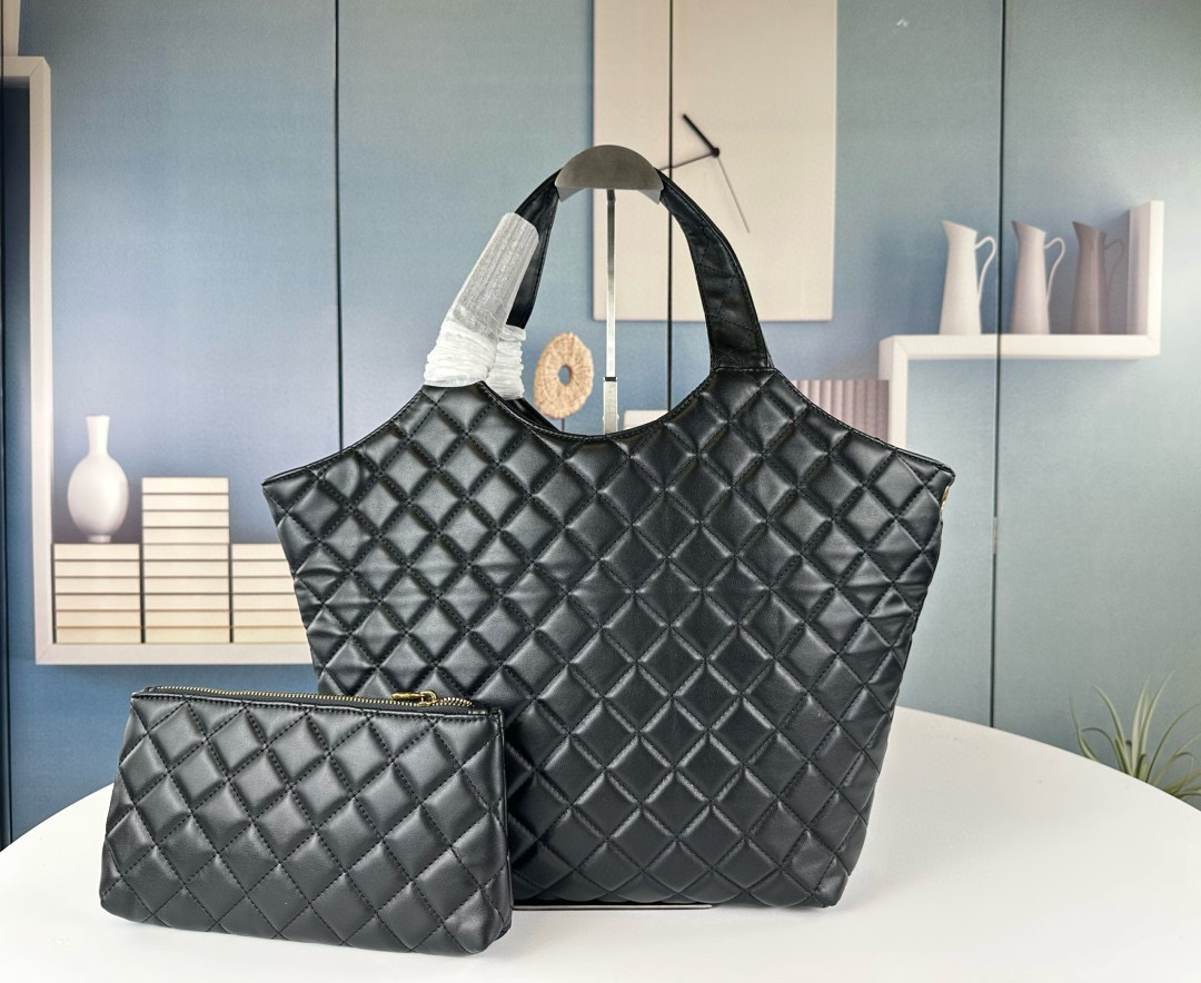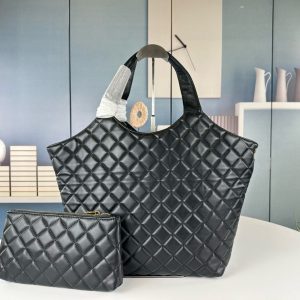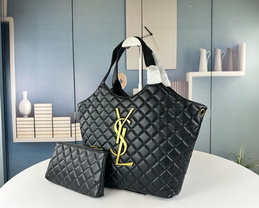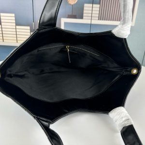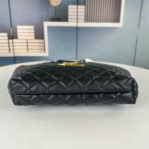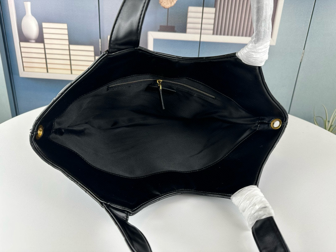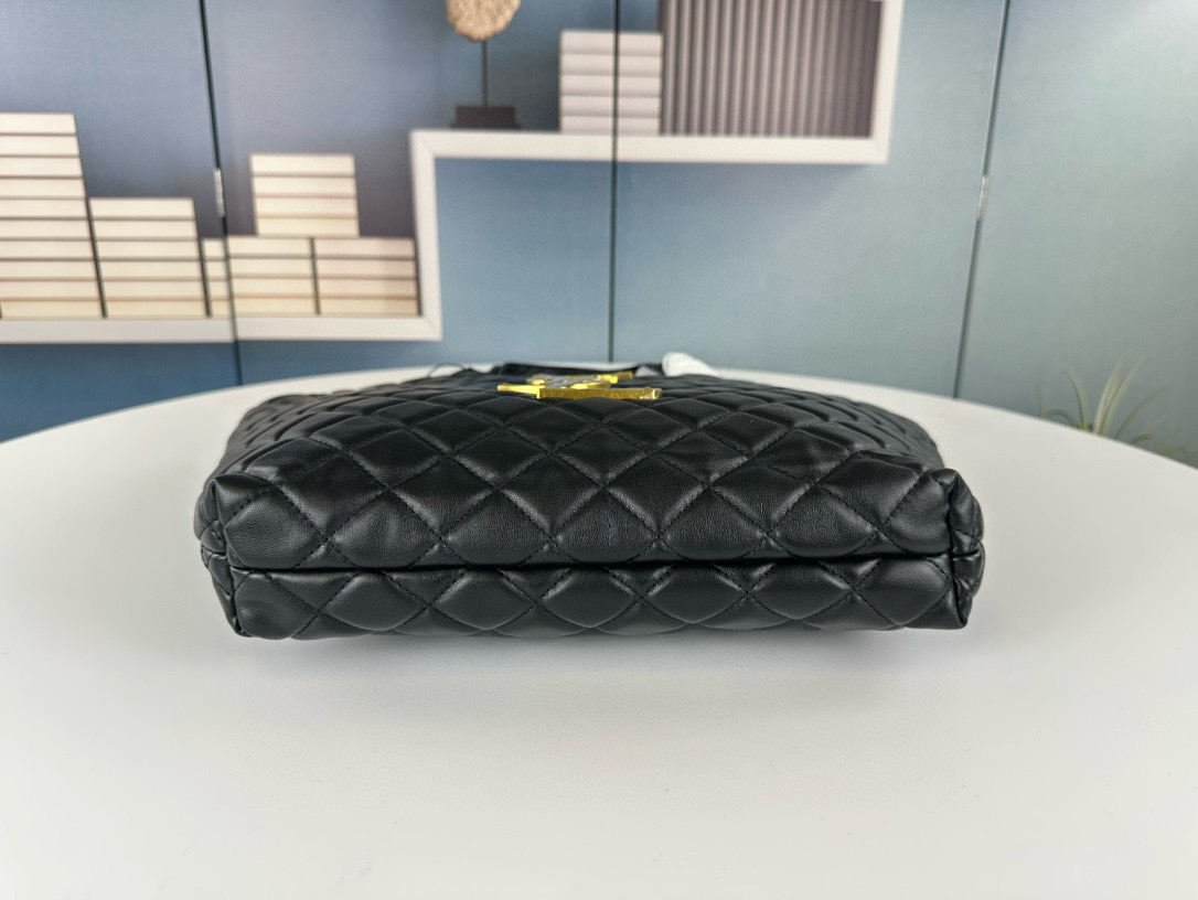 Maxibolso shopper en piel y forro de grosgrén, con cierre de barra, decorado con pespuntes acolchados con motivo cuadrado y logo de la marca YSL metalico en tonos dorados en la parte delantera. Cuenta con una bolsa mas pequeña extraible con cremallera. Se puede usar ancho o con los laterales cerrados.